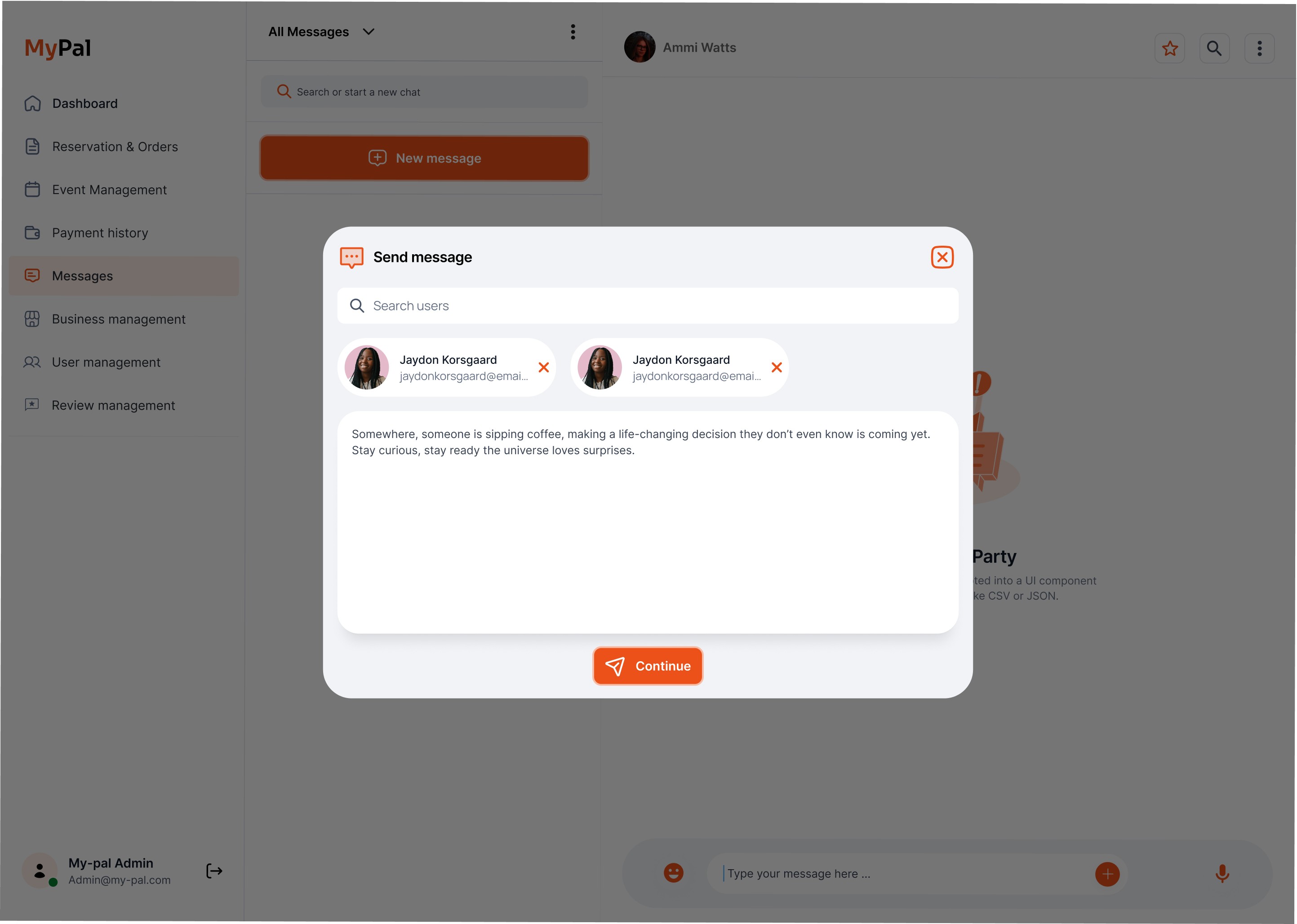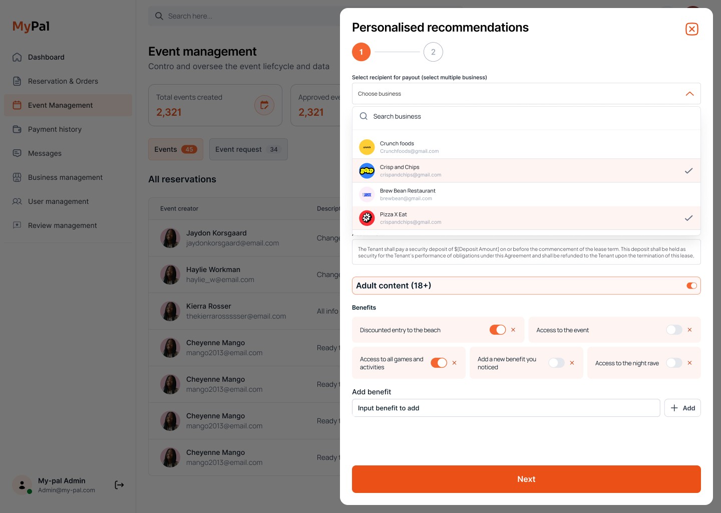Core Features Payment Management: View and track all incoming/outgoing payments with real-time transaction insights. Business Management: Assign discounts, track reservation volumes, and monitor partner performance. Event Management: Create, verify, and approve events. Suggest personalized event ideas to businesses. Reservations & Orders: Track and monitor all bookings in real-time. User & Review Management: Review user activity, analyze feedback trends, and manage user lifecycle actions. Integrated Messaging: Chat with businesses directly and connect with users via WhatsApp Business. Visual Analytics: Get quick insights into ticket sales, event attendance, user activity, and more.