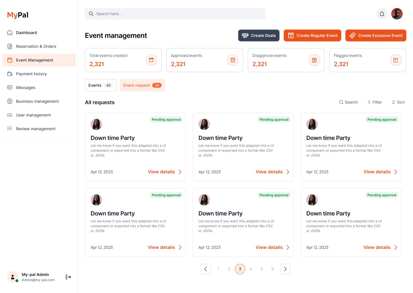 Summary metrics (Payments, Events, Pending Approvals, etc.)